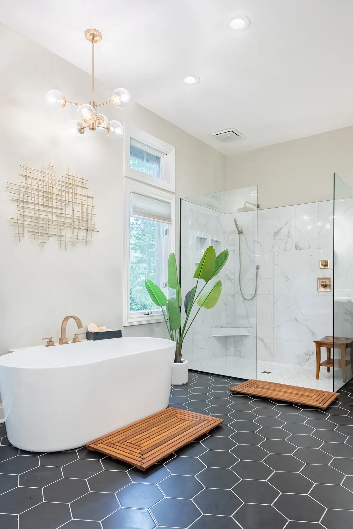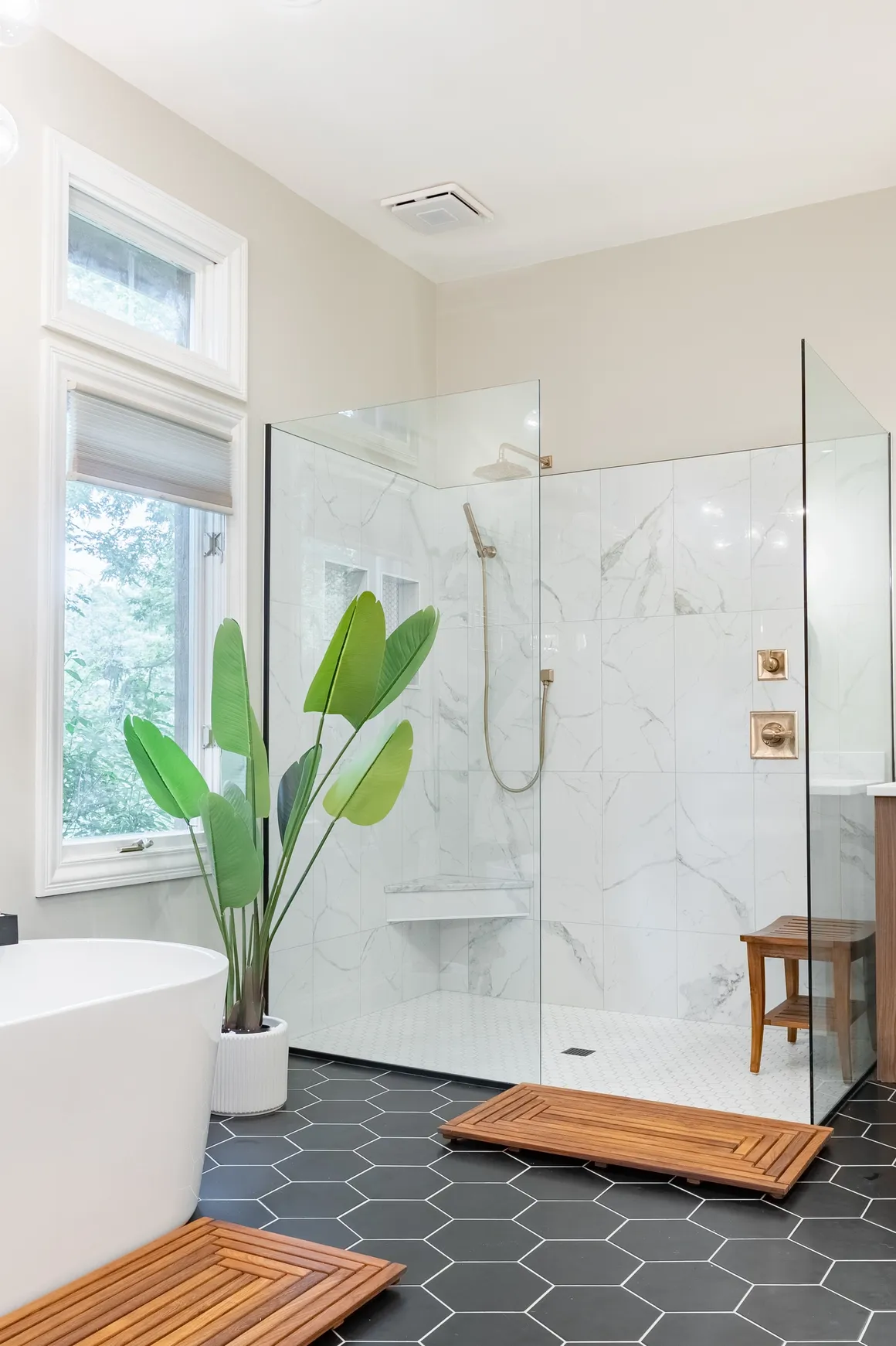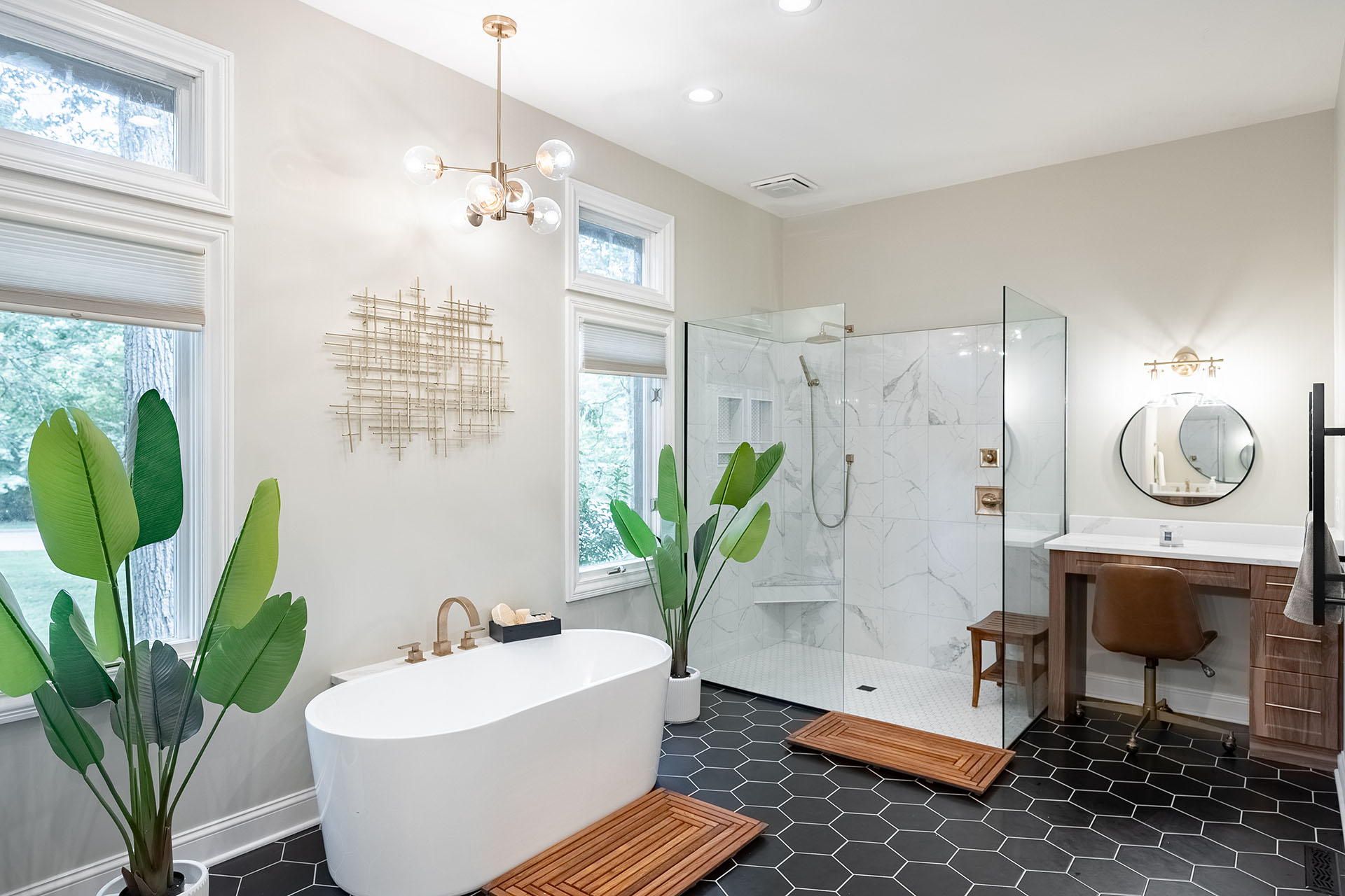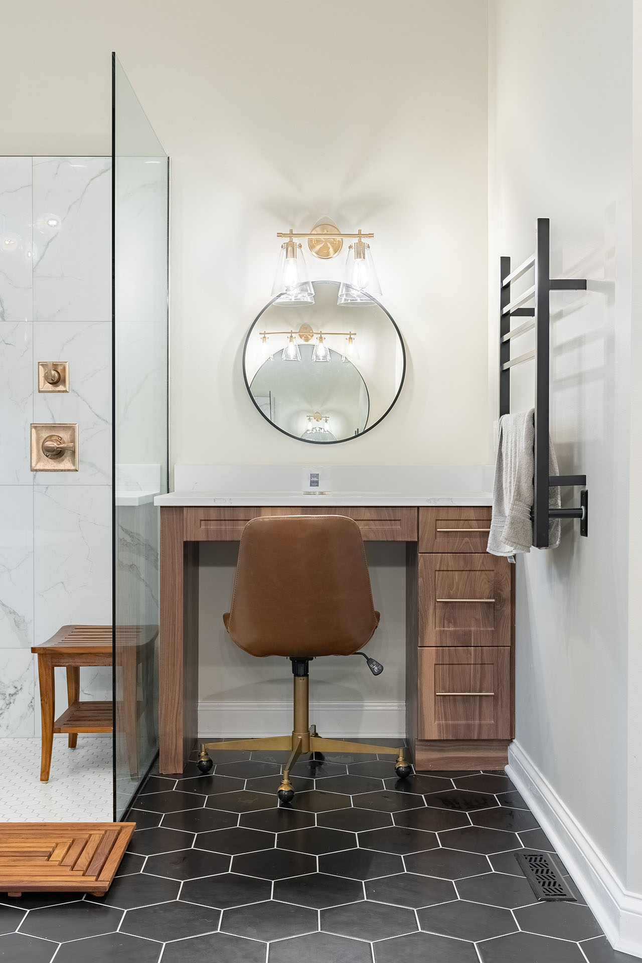 Very interesting bathroom remodel with black hexagon tile for the flooring, natural wood cabinets and a oversized shower without a door - this bathroom has a lot of features that we're asked for every day.