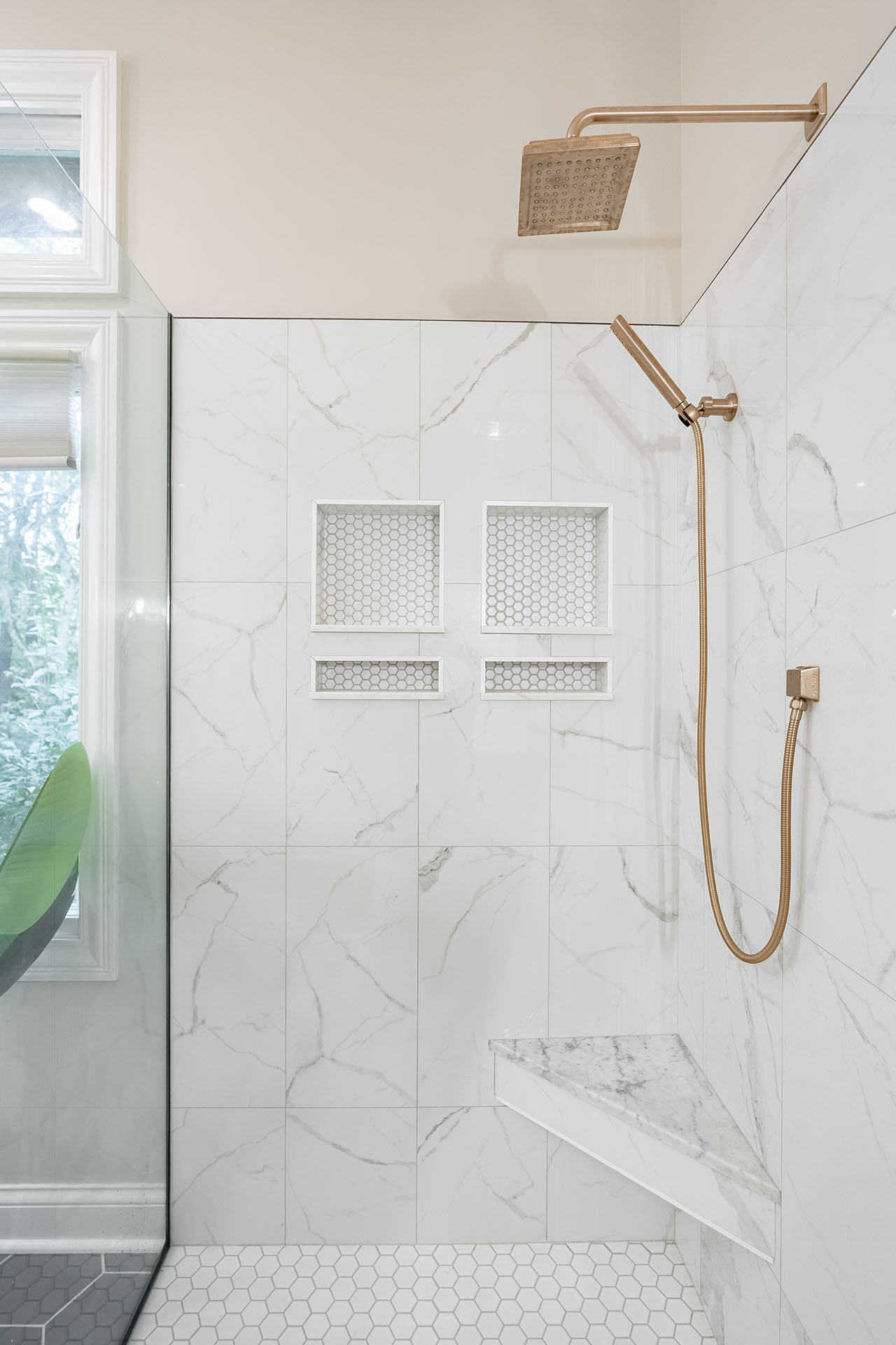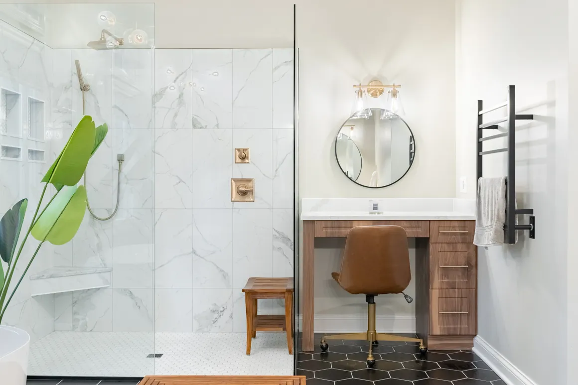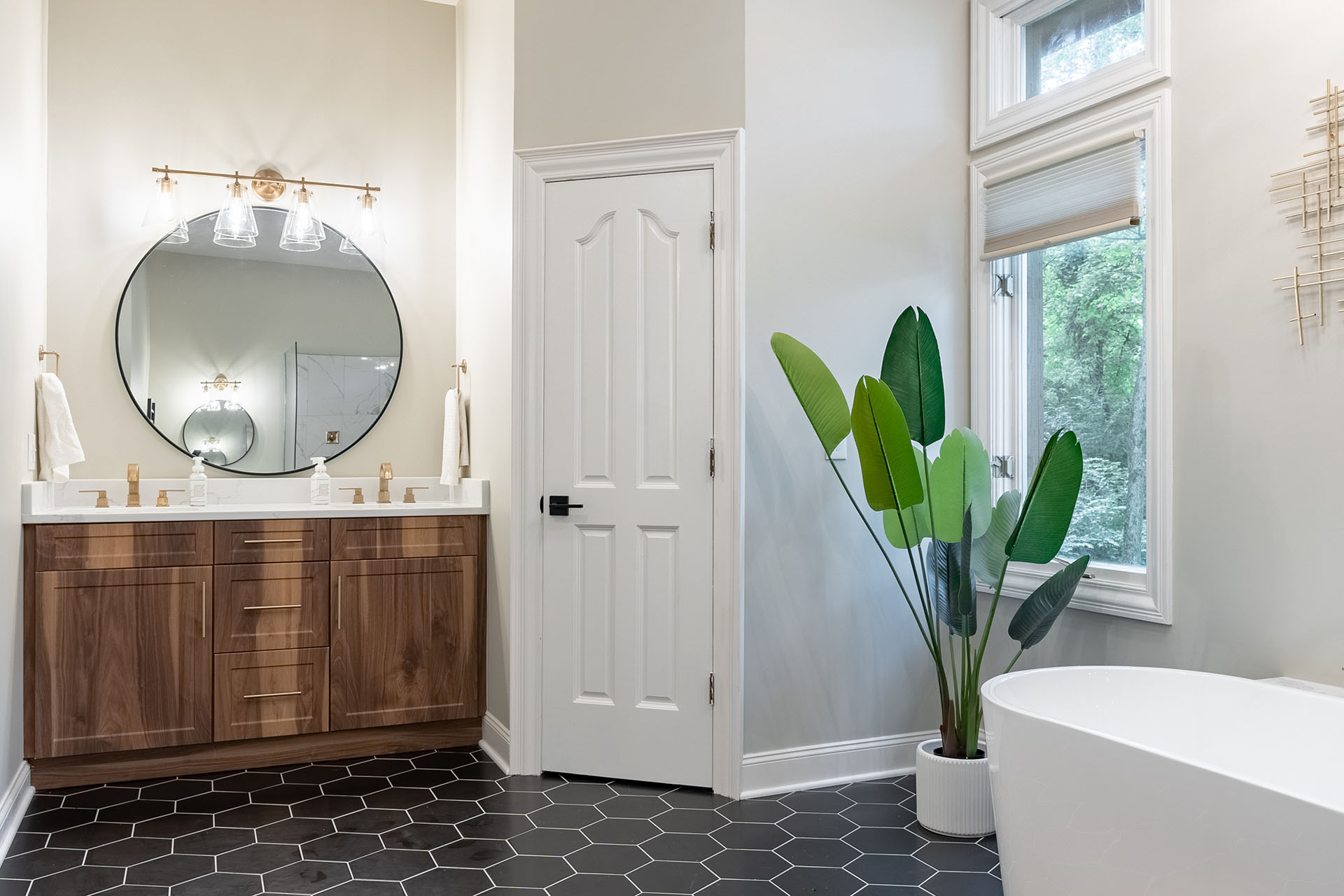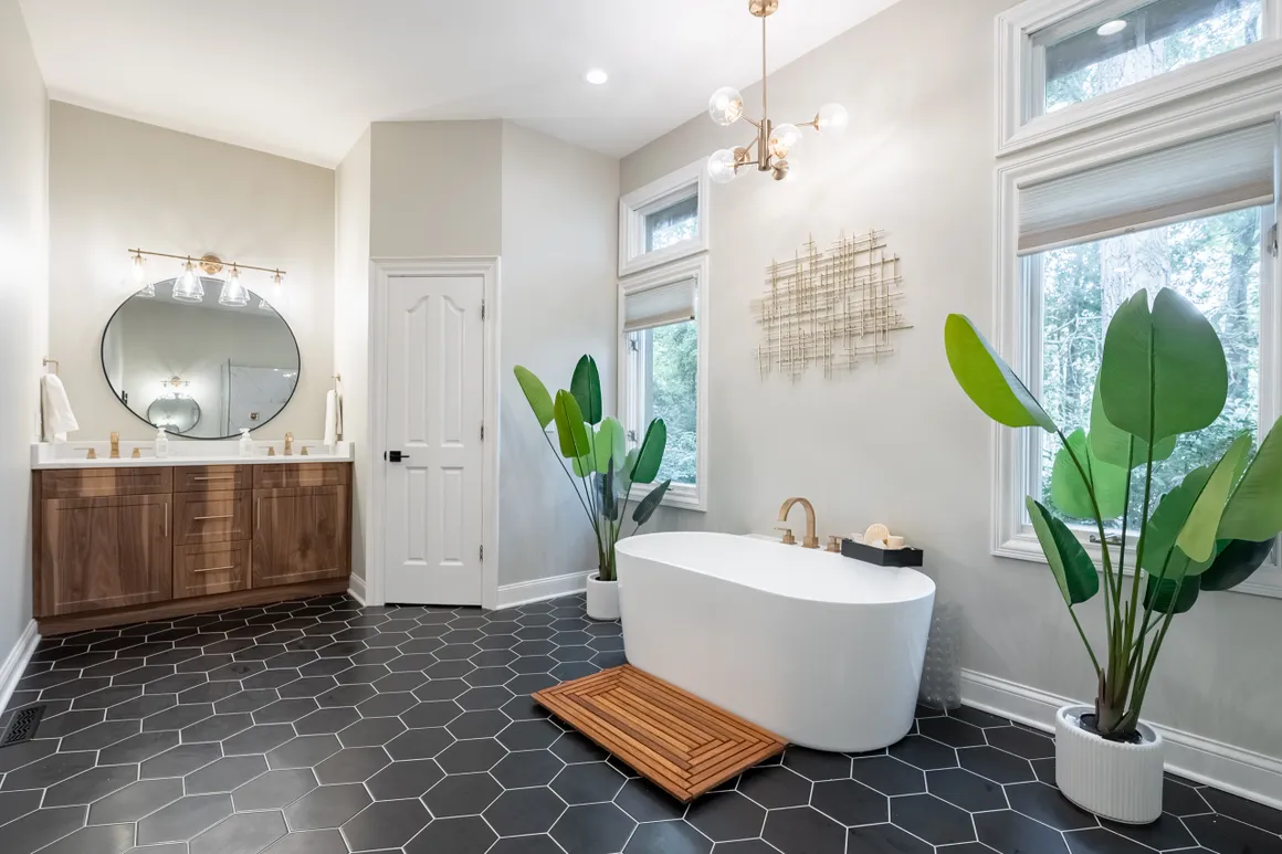 Very interesting bathroom remodel with black hexagon tile for the flooring, natural wood cabinets and a oversized shower without a door - this bathroom has a lot of features that we're asked for every day.